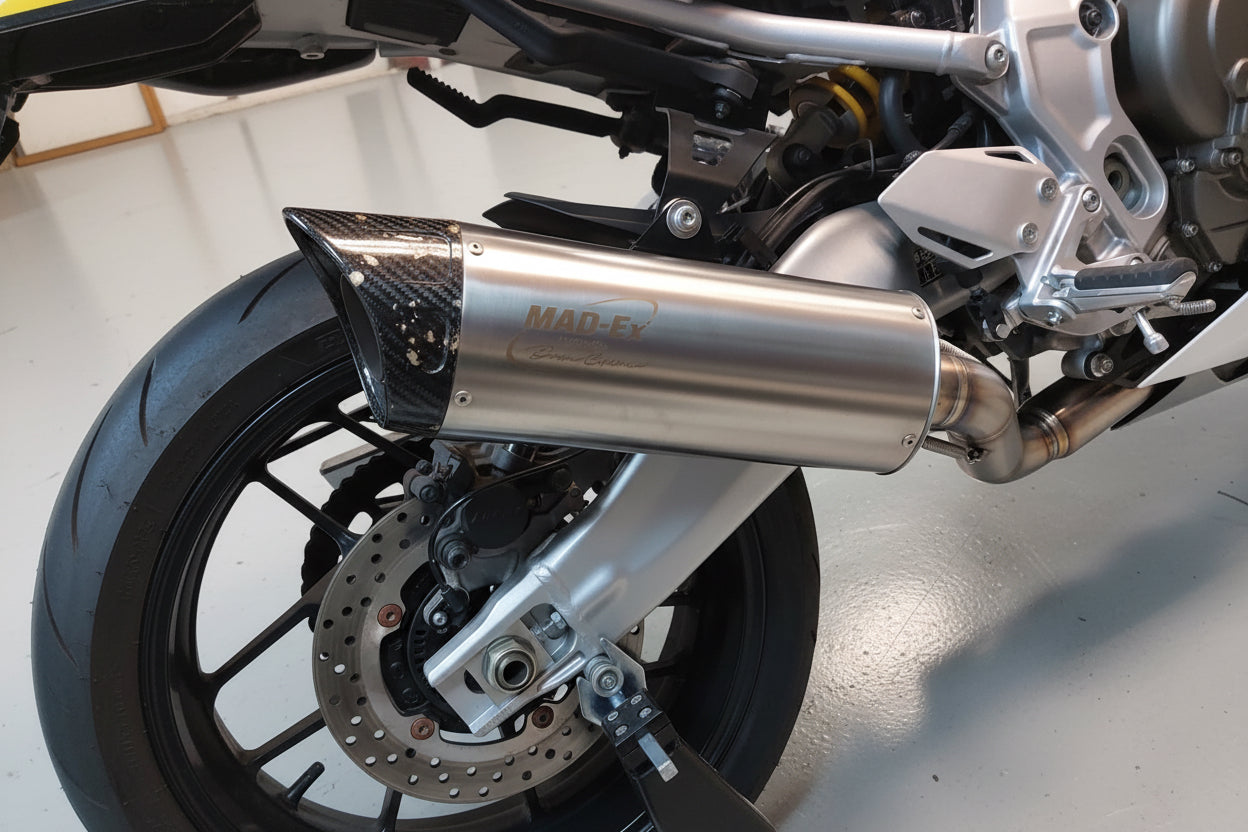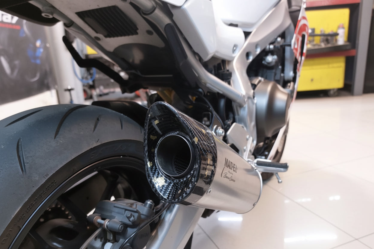 The end cap is a custom, heat-resistant full-carbon design produced in Portugal, giving the exhaust an exclusive, high-quality finish.